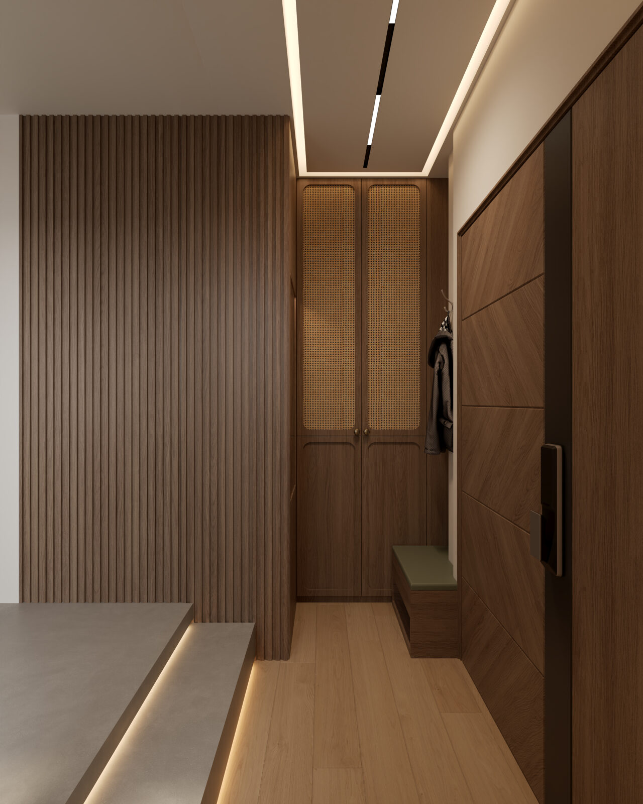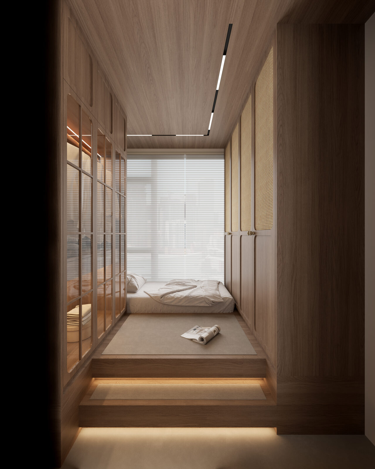 中房是兒子的睡房,由於兒子鍾情日式元素,所以設計師在原木配色的基礎下,打造了一個日系風格的房間,房間運用了地台床設計,兩級地台設有滲光燈效及米色地毯,左邊的高身衣櫃採用了木框清玻璃櫃門,右邊儲物櫃則加入了編籐元素,令這個無印風的房間更顯簡約自然。