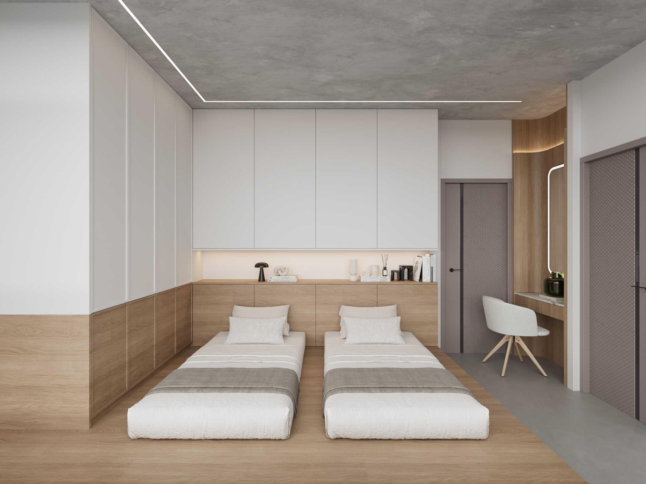 主人房延續全屋的簡約美學,同樣運用了地台床設計,靠牆的L形的大型高身衣櫃沿用了暖白色配搭原木色製作,提供了充裕的儲物空間,房間同樣採用了無主燈設計,假天花設有一條L形的嵌入色燈帶,與高身衣櫃互相呼應,假天花飾面則運用了淺灰色的藝術油漆,提升了整體設計的視覺質感,設計師更於房門旁邊的位置設置了一組化妝枱,運用了原木色配合內弧造型設計,為戶主提供了一個舒適溫暖的梳妝空間。