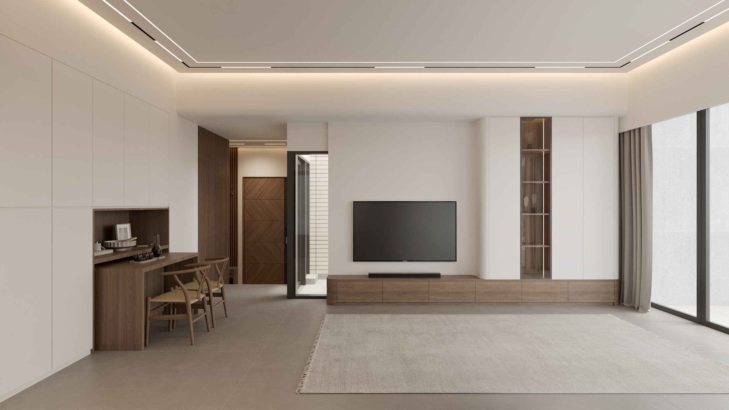 客廳放置了一個頂到天花的暖白色高身儲物櫃,修飾原則近大門的凹位,令視覺上更為方正。電視櫃以原木色製作,背後的暖白色背景牆連接着一組高身展示櫃,採用了黑框清玻璃櫃門,可供戶主展示裝飾品之餘,亦減低了整組傢俬的壓迫感。