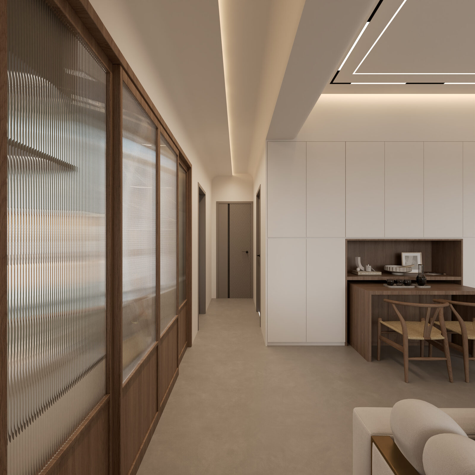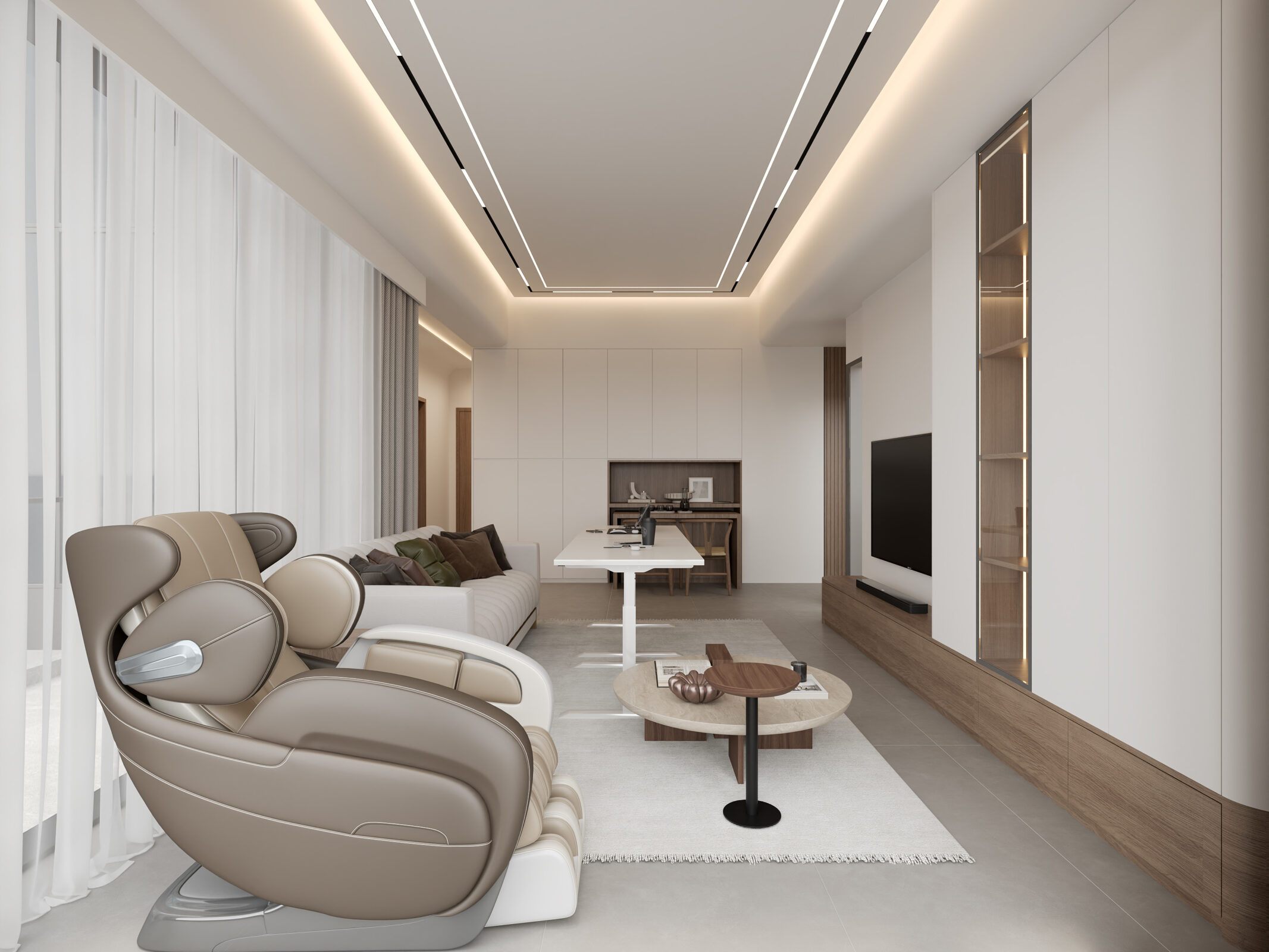 全屋以原木色配搭暖白色為主調,採用無主燈設計,客廳兩邊的假天花以弧面造型製作,中間的吊頂天花則安裝了嵌入式燈帶,四邊亦設有滲光燈效,配合暖白色的牆身與傢俬,感覺明亮通透。