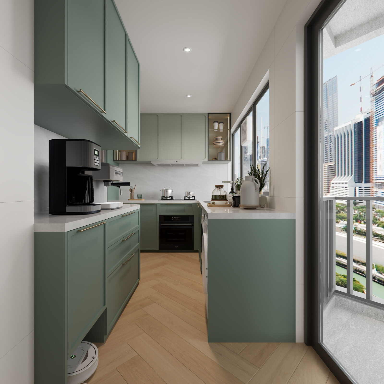 頭房為戶主的書房,設計師製作了一對原木色長虹玻璃趟門,提升了書房的空間感之餘,亦保障了書房的私隱度,書枱上方的吊櫃與儲物層板以及後邊的高身儲物櫃都刻意加入了復古綠色,以緩和書房較為單調的氛圍,近趟門一邊亦設有一個玻璃展示櫃,讓戶主可以展示自己的私人收藏品。