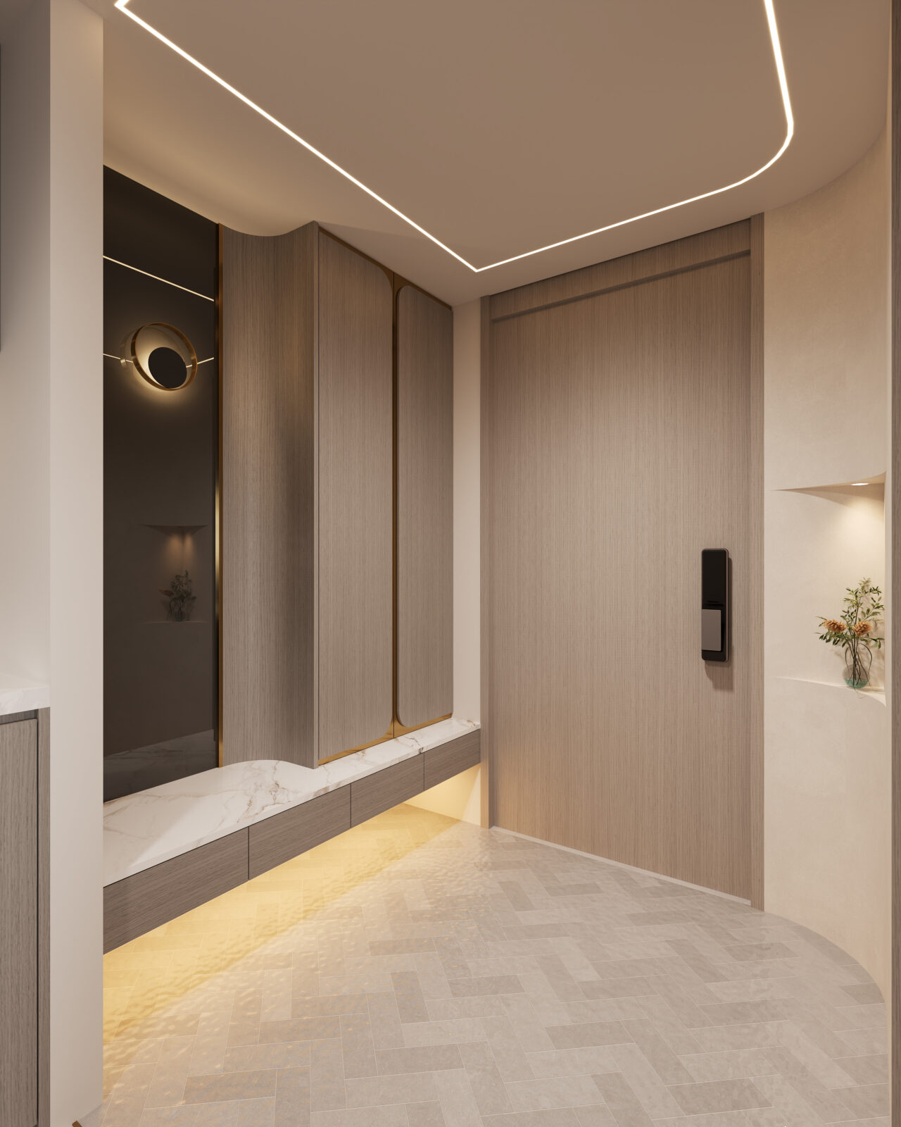設計師在U形假天花加入滲燈及射燈,取代了傳統的主燈作為主要照明,配合在玄關及梳化背後牆身加入鏡面元素,提升了客廳的空間感。