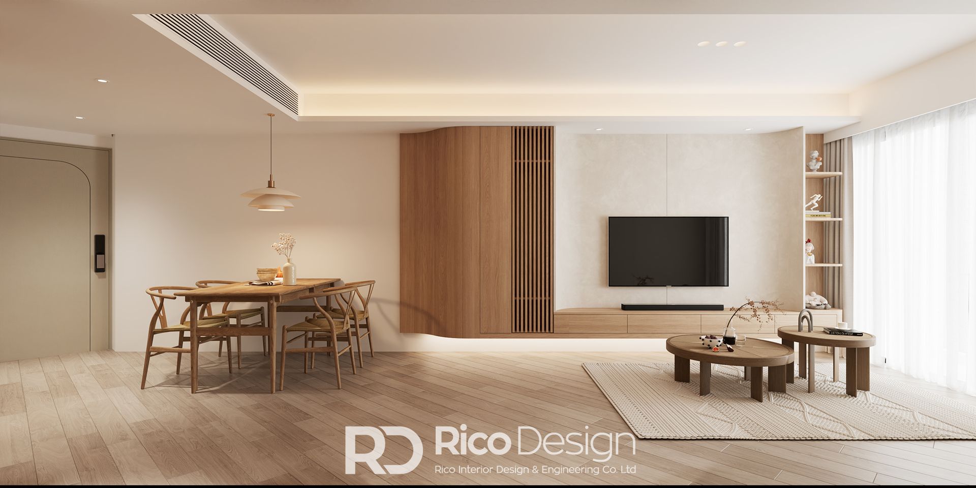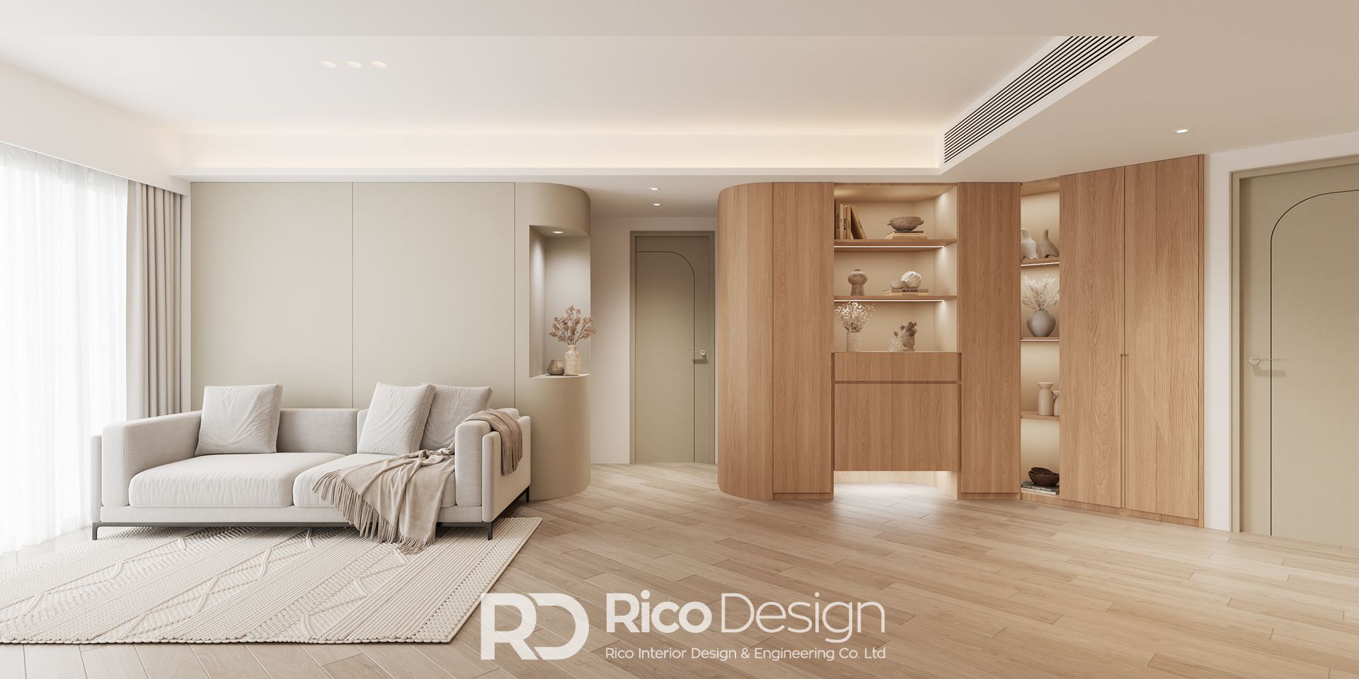 單位以現代北歐風格設計,運用米白色及原木傢俬作為主色調,利用條子及弧形元素,帶出柔和舒適的感覺