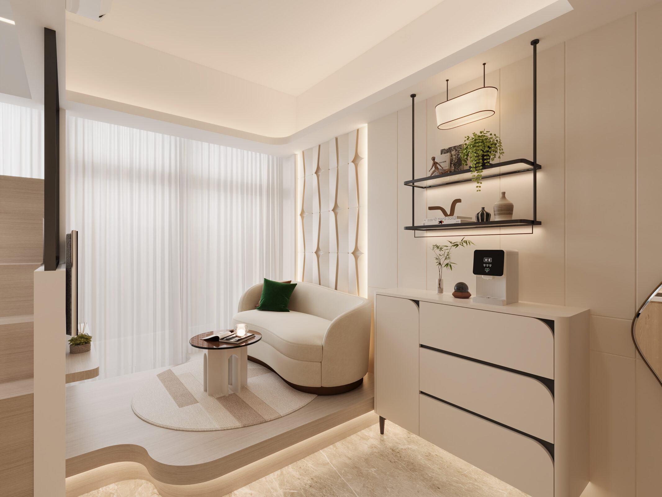 客廳的波浪形天花設計,為空間增添動感。為完美貫徹整體風格,客廳、睡房均選用柔紗窗簾,一白一啡製造層次感。牆身採用雲石拼出特別圖案,將奢華風格更是昇華。