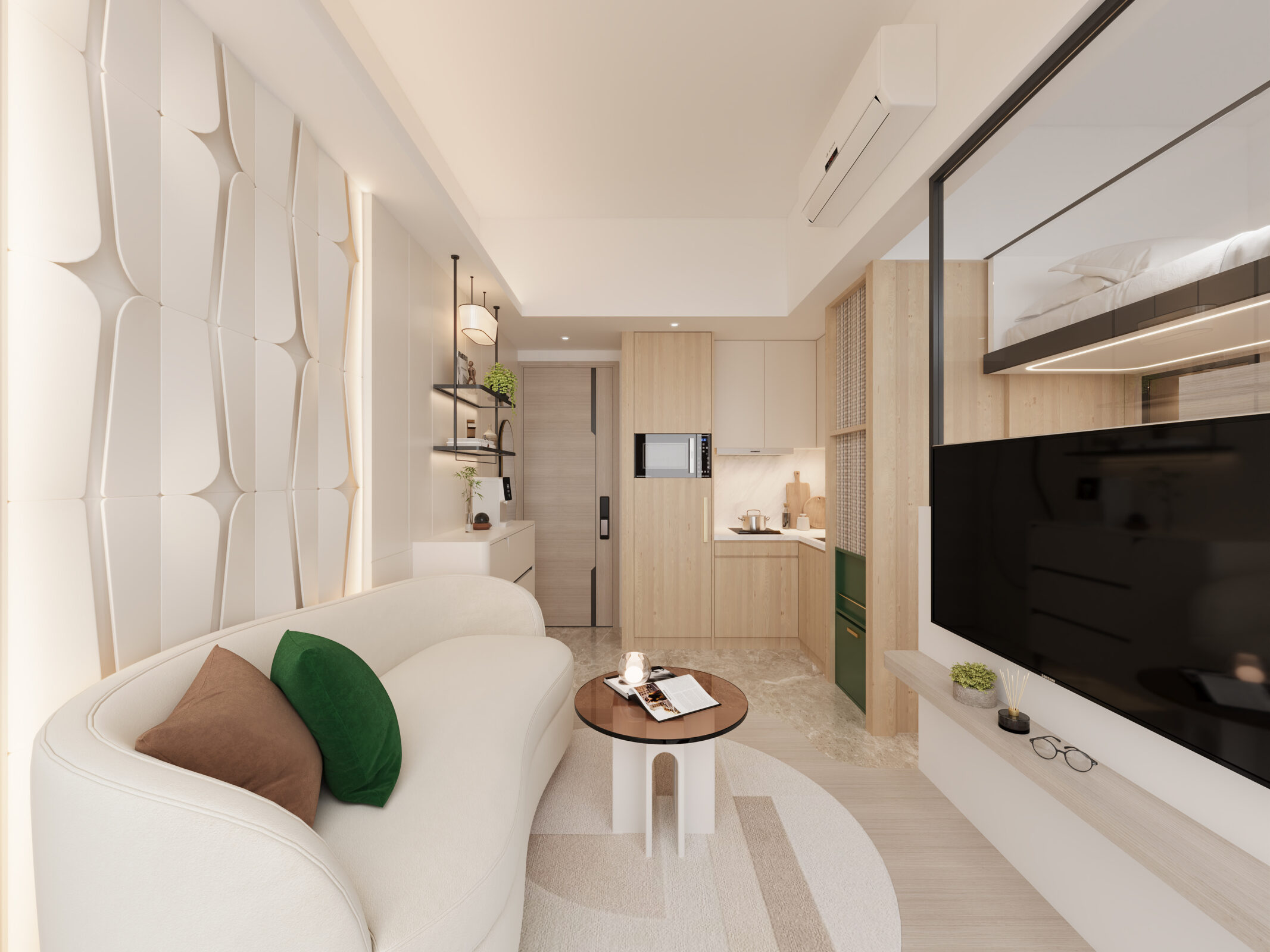 設計師設置了一幅暖白色圍身牆,由正門一直延伸至客廳,並連接梳化後面的特色背景牆,感覺時尚大方,另一邊的開放式廚房至睡房區域則以淺木色為主,配合全屋的無主燈設計,營造出簡約自然的感覺。