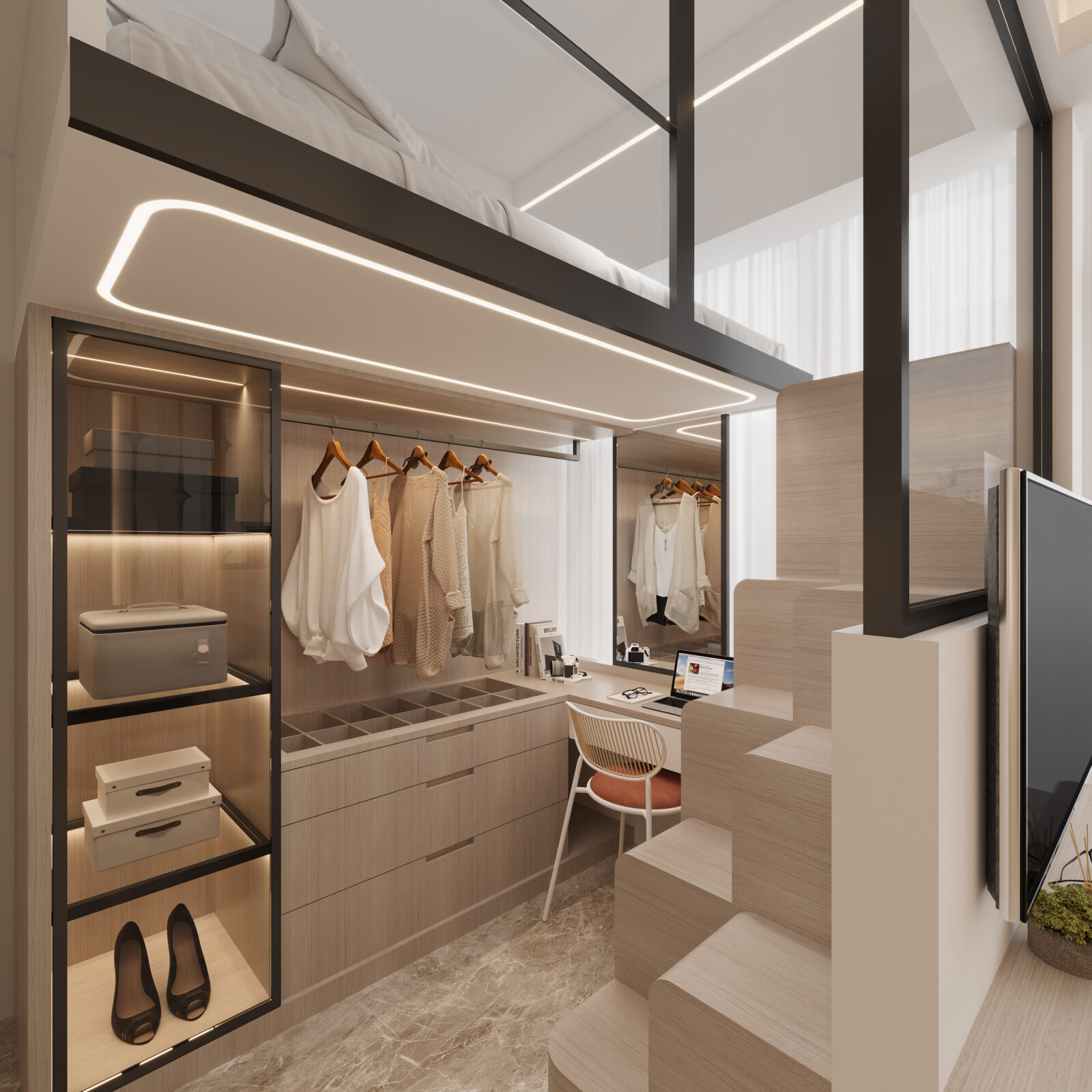 睡房設有一組上床下櫃的傢俬,下方運用了開放式的櫃體設計,掛衣通、飾物收納格子櫃、儲物抽屜、黑框清玻璃展示櫃及梳妝枱連半身鏡一應俱全,靠近玻璃半身牆一邊則設置了一組樓梯櫃,為戶主提供了充足的儲物空間。
