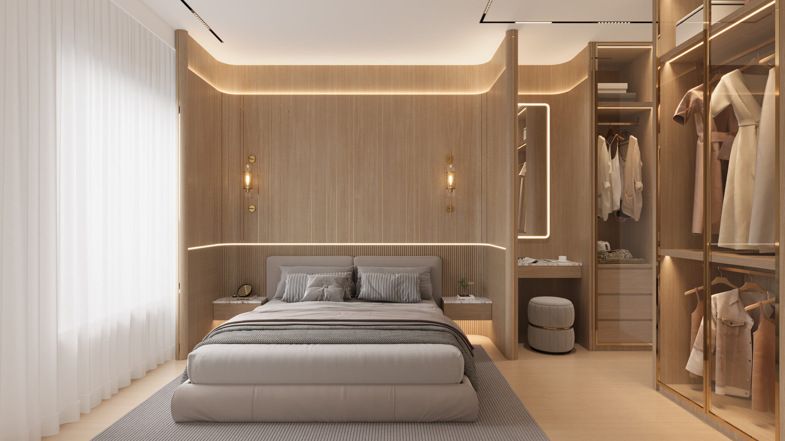 主人房以弧形圍身分隔了睡床及衣帽間的位置,分別在頂、底及床頭位置加入滲光效果,配合兩盞壁燈,營造出柔和舒適的氛圍。衣帽間除了有梳妝位置之外,也設有兩組大衣櫃,同樣運用了黃銅色金屬邊框玻璃櫃門,櫃內配有LED滲光燈帶,為整體的輕奢設計添上時尚感覺。