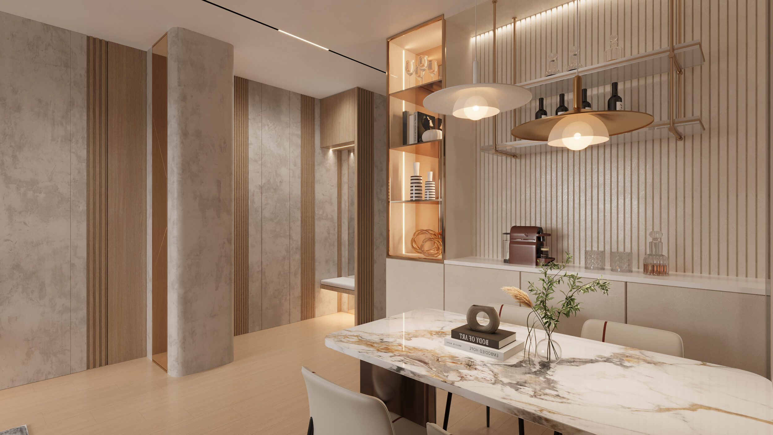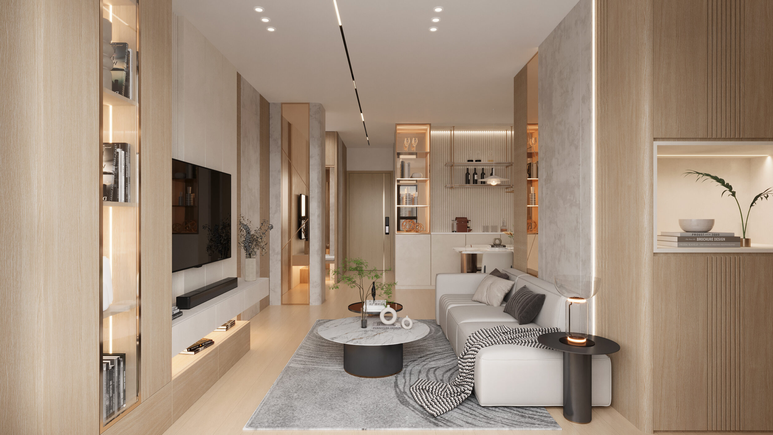 客廳以原木色配搭淺雲石紋飾面製作圍身,傢俬櫃門邊框及鏡面運用黃銅色金屬製作,並採用了無主燈設計,以筒燈及天花嵌入式路軌燈作為主要照明,輔以特色座地燈、飯枱吊燈及傢俬滲光燈效,營造時尚與低調奢華的氛圍。