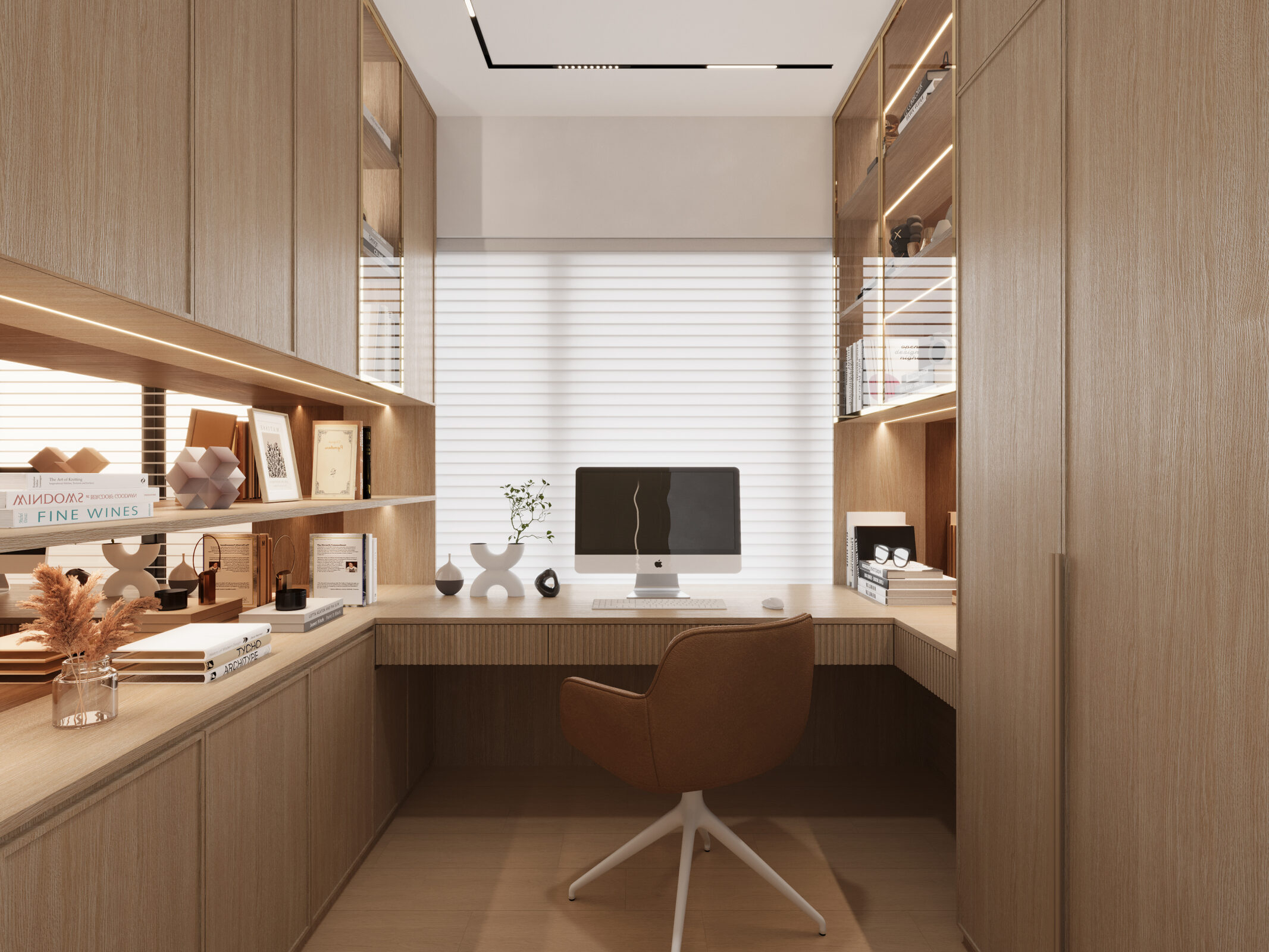 書房設計以實用為主,兩邊設有原木色到頂儲物高櫃,上端部份的展示櫃位置沿用了黃銅色金屬邊框玻璃櫃門,右邊櫃體沿窗邊延伸出一張書枱,配合兩邊櫃體的中空位置,為戶主提供了一個龐大的U形工作枱面。