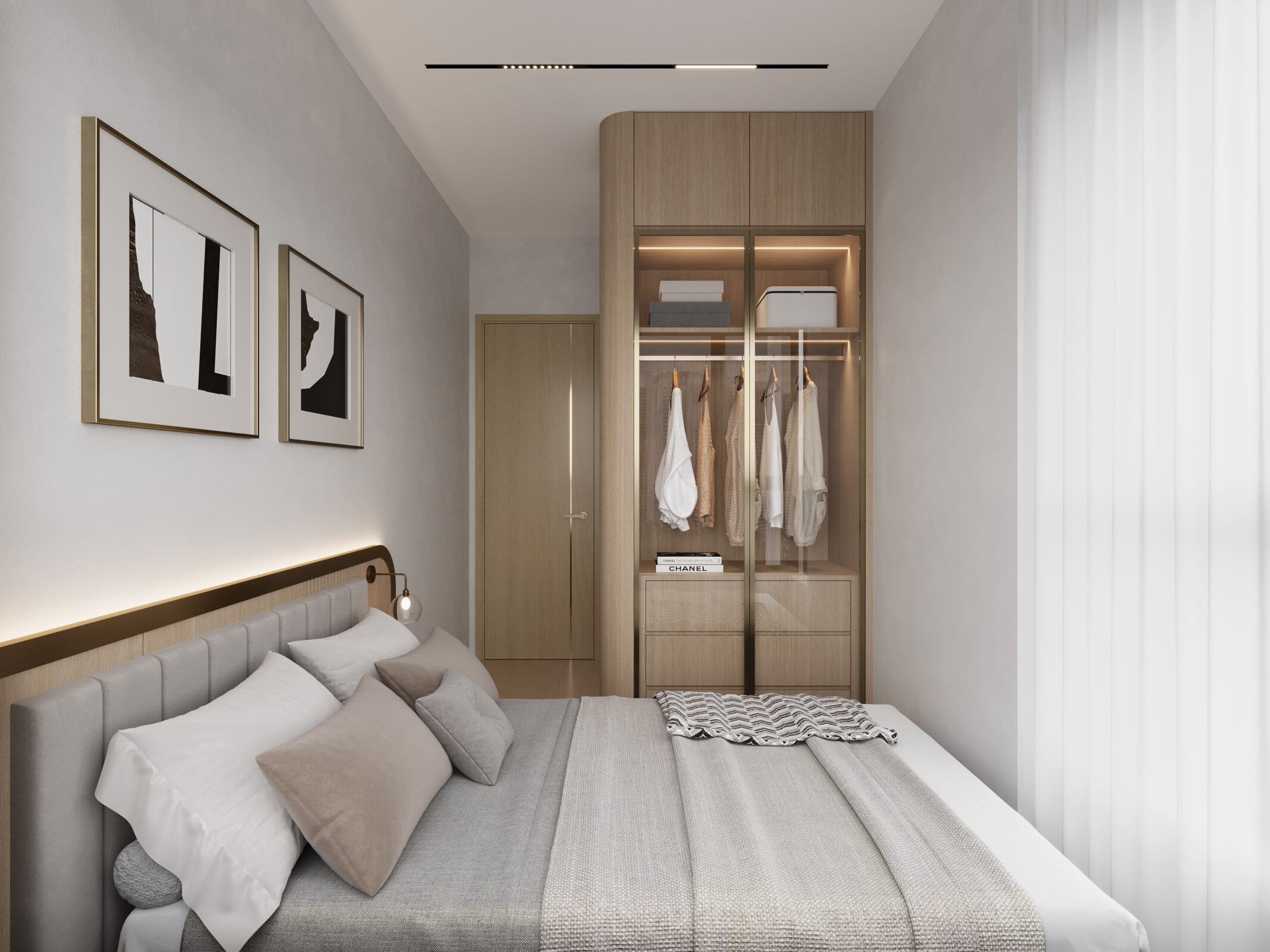 睡房設有一組上床下櫃的傢俬,下方運用了開放式的櫃體設計,掛衣通、飾物收納格子櫃、儲物抽屜、黑框清玻璃展示櫃及梳妝枱連半身鏡一應俱全,靠近玻璃半身牆一邊則設置了一組樓梯櫃,為戶主提供了充足的儲物空間。